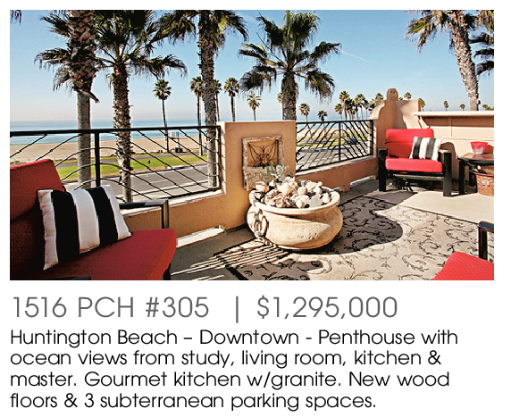 1516 PCH #305 | $1,295,000 Huntington Beach – Downtown - Penthouse with ocean views from study, living room, kitchen & master. Gourmet kitchen w/granite. New wood floors & 3 subterranean parking spaces.