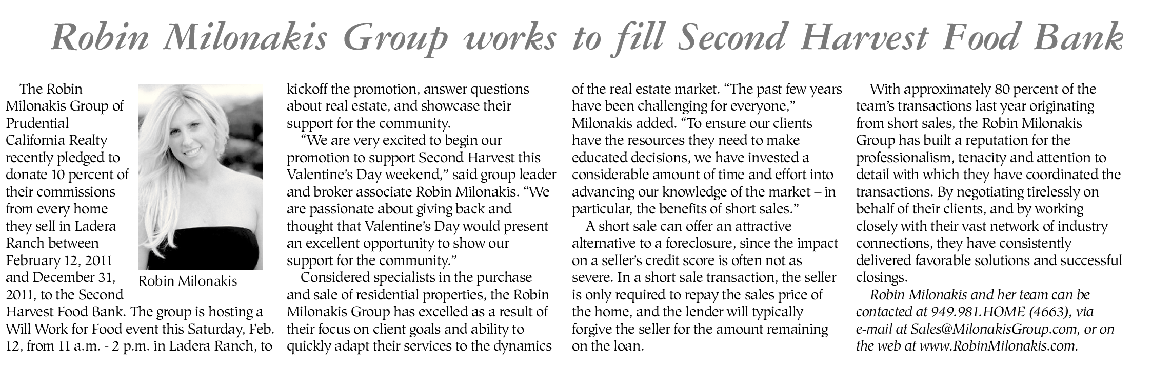 The Robin Milonakis Group of Prudential California Realty recently pledged to donate 10 percent of their commissions from every home they sell in Ladera Ranch between February 12, 2011 and December 31, Robin Milonakis 2011, to the Second Harvest Food Bank. The group is hosting a Will Work for Food event this Saturday, Feb.