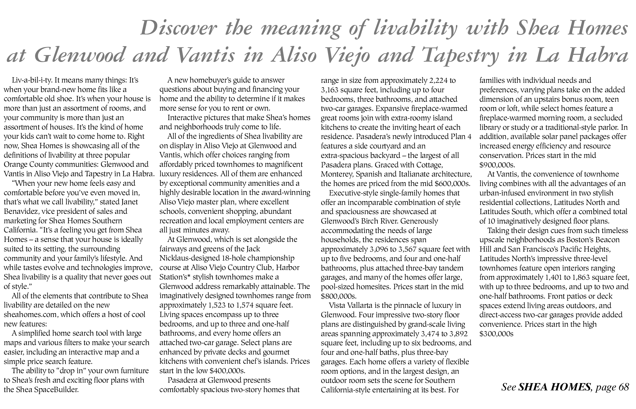 Liv-a-bil-i-ty. It means many things: It’s when your brand-new home fits like a comfortable old shoe. It’s when your house is more than just an assortment of rooms, and your community is more than just an assortment of houses. It’s the kind of home your kids can’t wait to come home to. Right now, Shea Homes is showcasing all of the definitions of livability at three popular Orange County communities: Glenwood and Vantis in Aliso Viejo and Tapestry in La Habra.