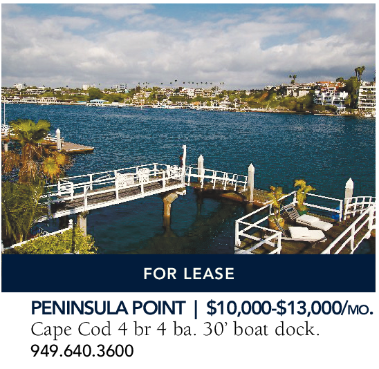 PENINSULA POINT | $10,000-$13,000/MO. Cape Cod 4 br 4 ba. 30’ boat dock. 949.640.3600