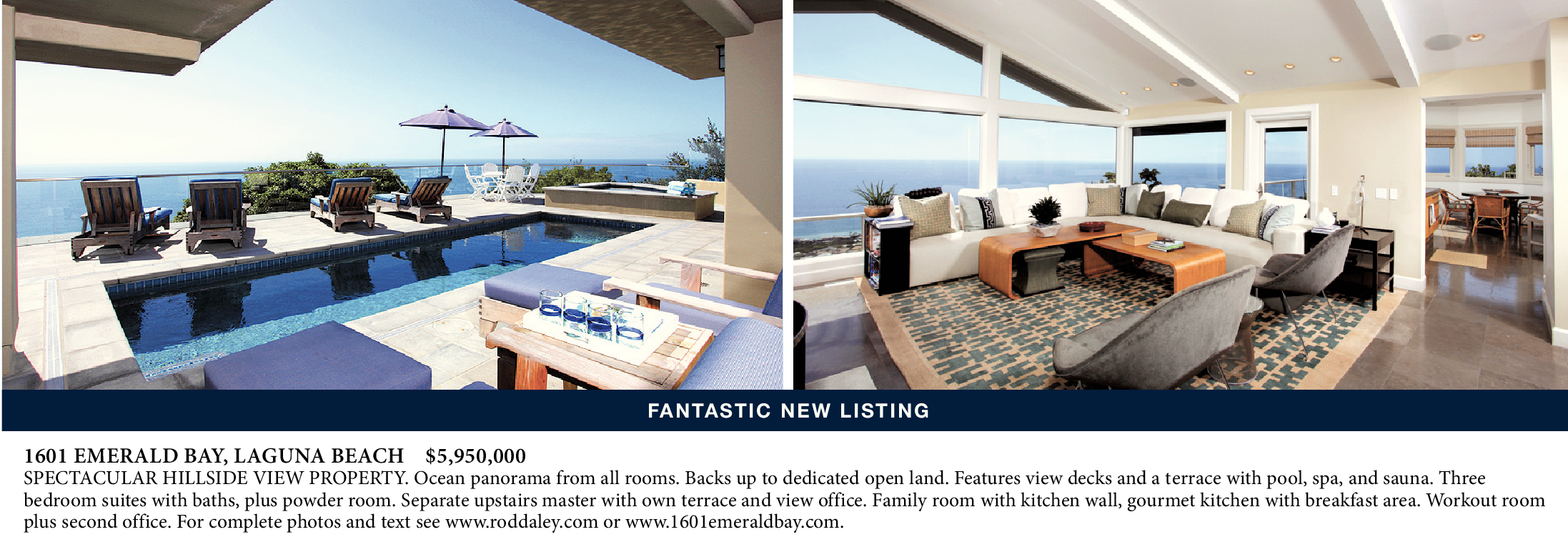 1601 EMERALD BAY, LAGUNA BEACH $5,950,000 SPECTACULAR HILLSIDE VIEW PROPERTY. Ocean panorama from all rooms. Backs up to dedicated open land. Features view decks and a terrace with pool, spa, and sauna. Three bedroom suites with baths, plus powder room. Separate upstairs master with own terrace and view office. Family room with kitchen wall, gourmet kitchen with breakfast area. Workout room plus second office. For complete photos and text see www.roddaley.com or www.1601emeraldbay.com.