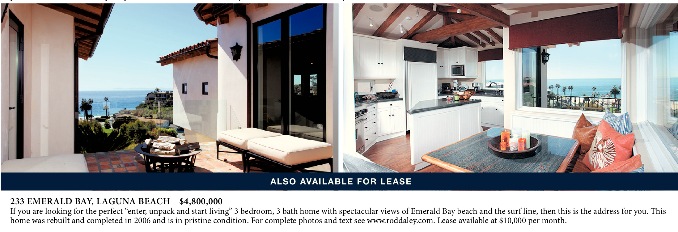233 EMERALD BAY, LAGUNA BEACH $4,800,000 If you are looking for the perfect “enter, unpack and start living” 3 bedroom, 3 bath home with spectacular views of Emerald Bay beach and the surf line, then this is the address for you. This home was rebuilt and completed in 2006 and is in pristine condition. For complete photos and text see www.roddaley.com. Lease available at $10,000 per month.