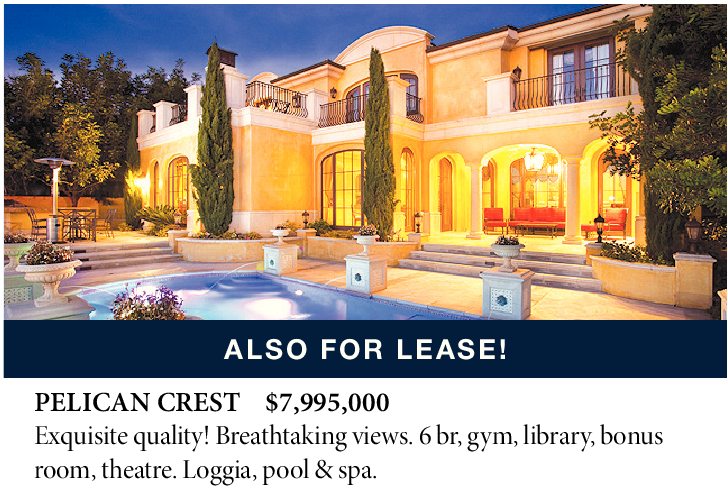 PELICAN CREST $7,995,000 Exquisite quality! Breathtaking views. 6 br, gym, library, bonus room, theatre. Loggia, pool & spa.