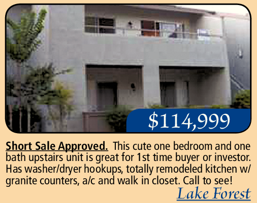 Short Sale Approved. This cute one bedroom and one bath upstairs unit is great for 1st time buyer or investor. Has washer/dryer hookups, totally remodeled kitchen w/ granite counters, a/c and walk in closet. Call to see! Lake Forest