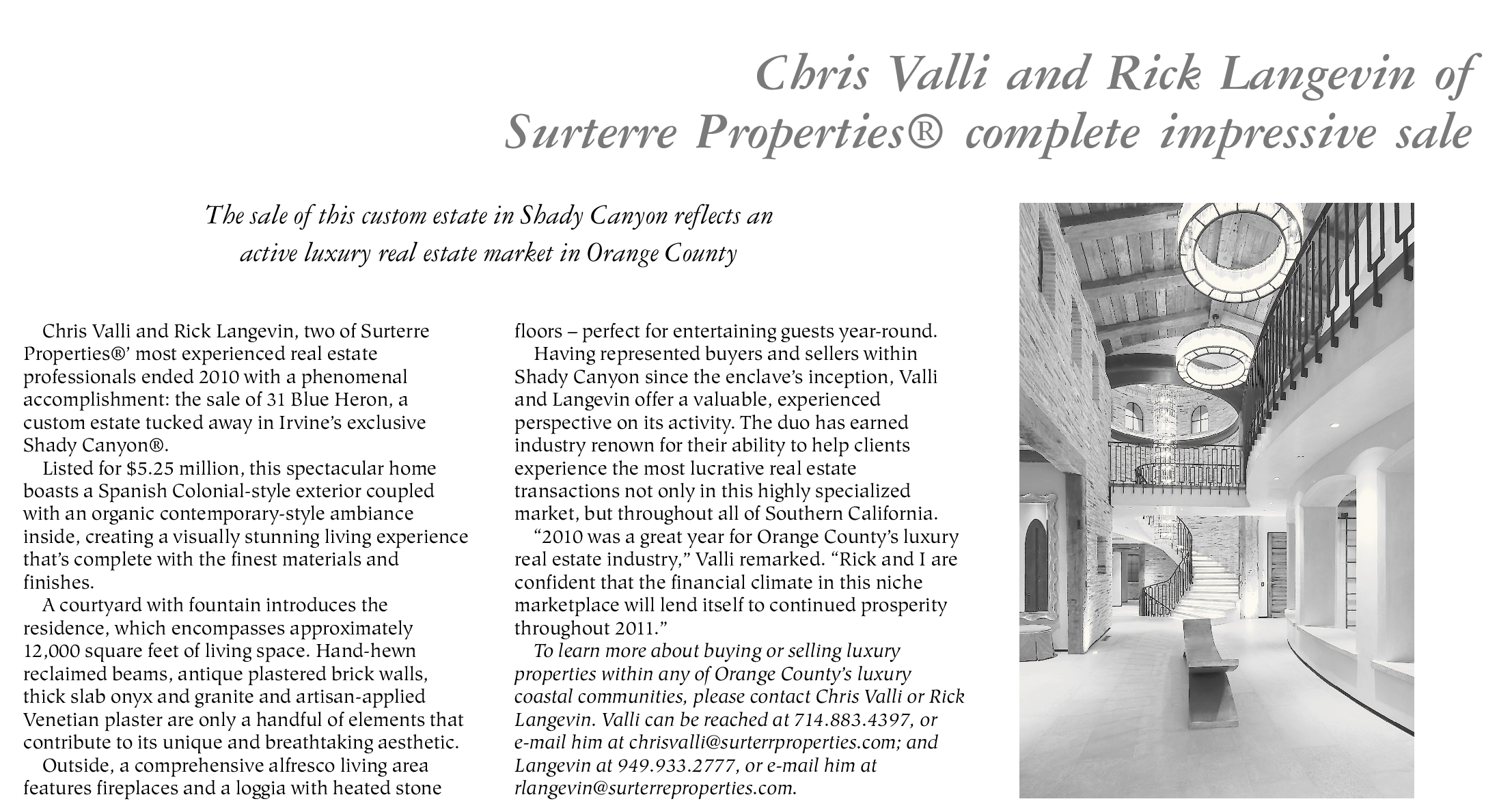 Chris Valli and Rick Langevin, two of Surterre Properties®’ most experienced real estate professionals ended 2010 with a phenomenal accomplishment: the sale of 31 Blue Heron, a custom estate tucked away in Irvine’s exclusive Shady Canyon®.