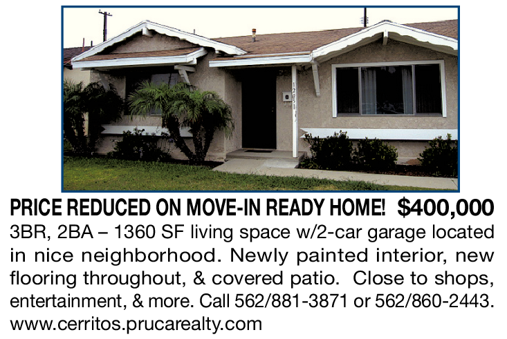 PRICE REDUCED ON MOVE-IN READY HOME! $400,000 3BR, 2BA – 1360 SF living space w/2-car garage located in nice neighborhood. Newly painted interior, new flooring throughout, & covered patio. Close to shops, entertainment, & more. Call 562/881-3871 or 562/860-2443. www.cerritos.prucarealty.com