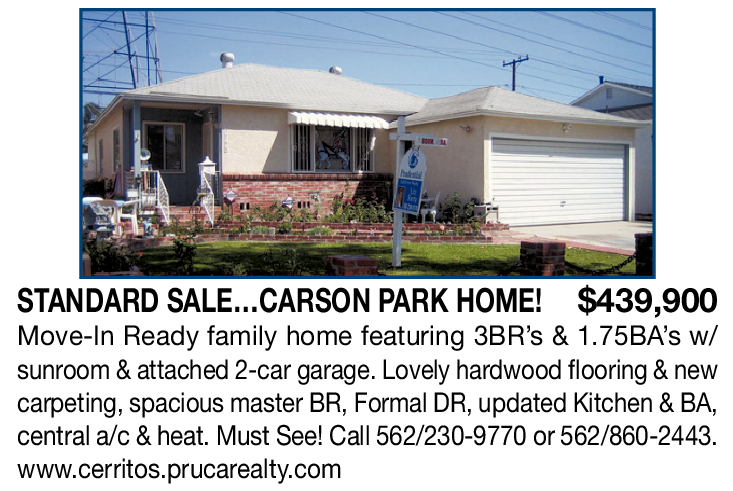 STANDARD SALE…CARSON PARK HOME! $439,900 Move-In Ready family home featuring 3BR’s & 1.75BA’s w/ sunroom & attached 2-car garage. Lovely hardwood flooring & new carpeting, spacious master BR, Formal DR, updated Kitchen & BA, central a/c & heat. Must See! Call 562/230-9770 or 562/860-2443. www.cerritos.prucarealty.com