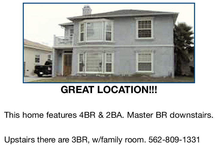 Upstairs there are 3BR, w/family room. 562-809-1331