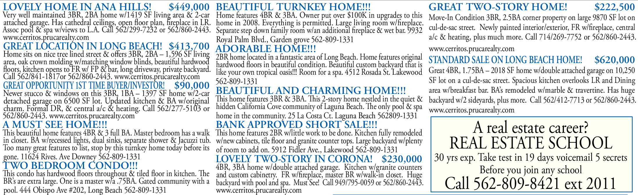 www.cerritos.prucarealty.com STANDARD SALE ON LONG BEACH HOME! $620,000 Great 4BR, 1.75BA – 2018 SF home w/double attached garage on 10,250 SF lot on a cul-de-sac street. Spacious kitchen overlooks LR and Dining area w/breakfast bar. BA’s remodeled w/marble & travertine. Has huge backyard w/2 sideyards, plus more. Call 562/412-7713 or 562/860-2443.