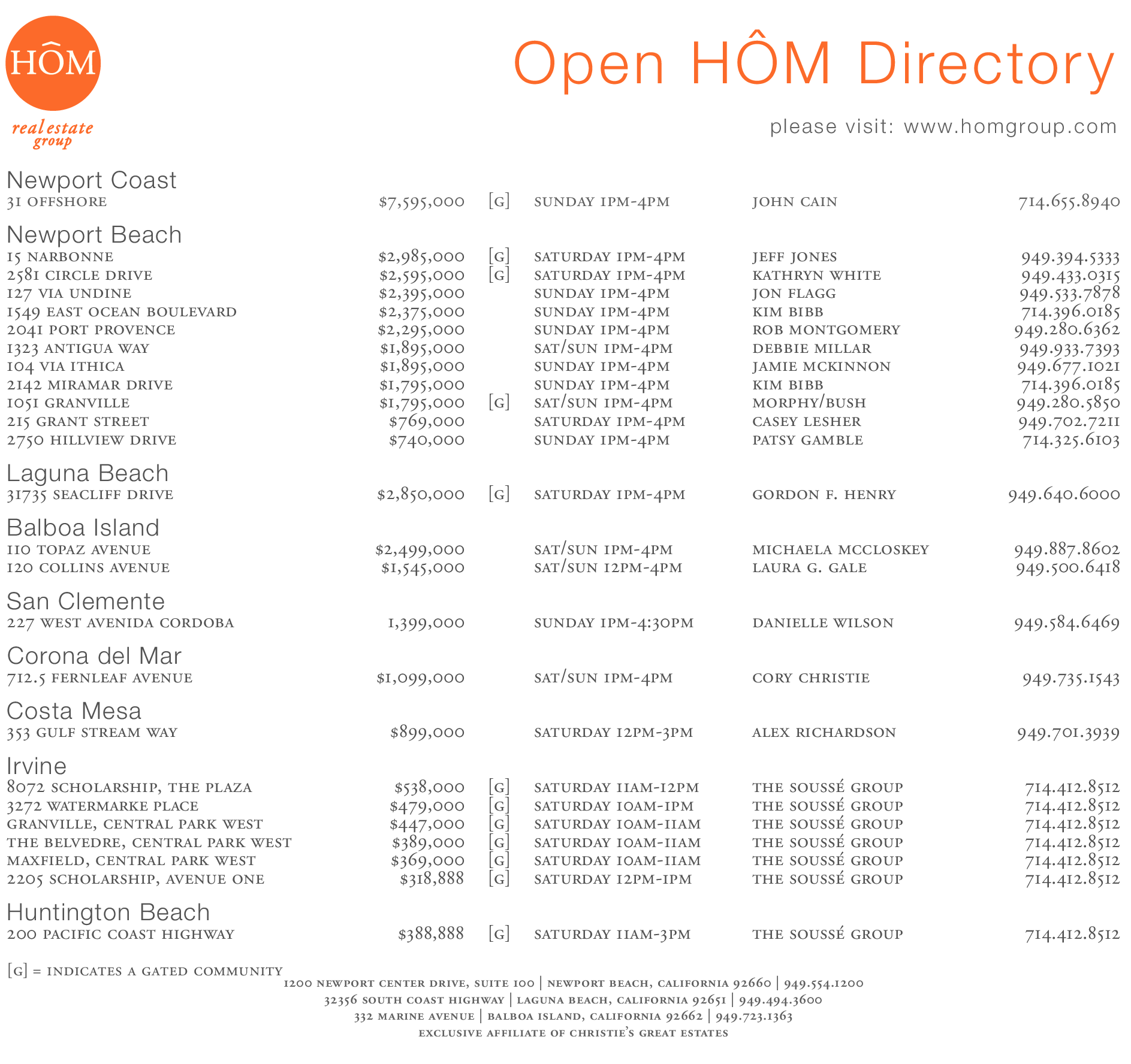 15 narbonne $2,985,000 [g] saturday 1pm-4pm jeff jones 949.394.5333 2581 circle drive $2,595,000 [g] saturday 1pm-4pm kathryn white 949.433.0315 127 via undine $2,395,000 sunday 1pm-4pm jon flagg 949.533.7878 1549 east ocean boulevard $2,375,000 sunday 1pm-4pm kim bibb 714.396.0185 2041 port provence $2,295,000 sunday 1pm-4pm rob montgomery 949.280.6362 1323 antigua way $1,895,000 sat/sun 1pm-4pm debbie millar 949.933.7393 104 via ithica $1,895,000 sunday 1pm-4pm jamie mckinnon 949.677.1021 2142 miramar drive $1,795,000 sunday 1pm-4pm kim bibb 714.396.0185 1051 granville $1,795,000 [g] sat/sun 1pm-4pm morphy/bush 949.280.5850 215 grant street $769,000 saturday 1pm-4pm casey lesher 949.702.7211 2750 hillview drive $740,000 sunday 1pm-4pm patsy gamble 714.325.6103