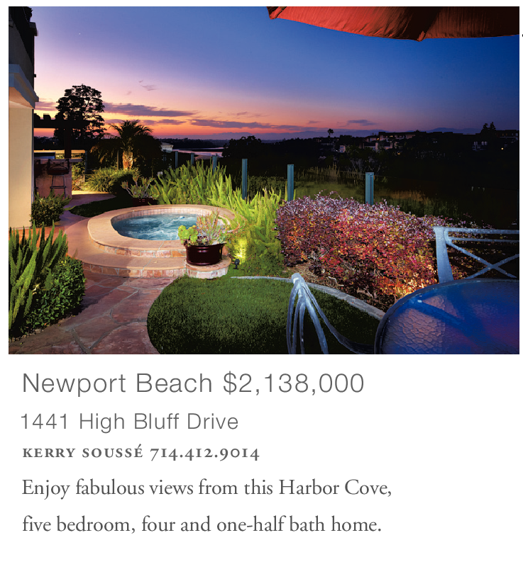 Newport Beach $2,138,000 1441 High Bluff Drive kerry soussé 714.412.9014 Enjoy fabulous views from this Harbor Cove, five bedroom, four and one-half bath home.