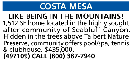 COSTA MESA LIKE BEING IN THE MOUNTAINS! 1,512 SF home located in the highly sought after community of Seabluff Canyon. Hidden in the trees above Talbert Nature Preserve, community offers pool/spa, tennis & clubhouse. $435,000. (497109) CALL (800) 387-7940