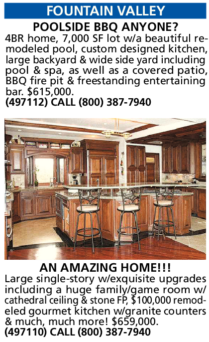 FOUNTAIN VALLEY POOLSIDE BBQ ANYONE? 4BR home, 7,000 SF lot w/a beautiful remodeled pool, custom designed kitchen, large backyard & wide side yard including pool & spa, as well as a covered patio, BBQ fire pit & freestanding entertaining bar. $615,000. (497112) CALL (800) 387-7940 AN AMAZING HOME!!! Large single-story w/exquisite upgrades including a huge family/game room w/ cathedral ceiling & stone FP, $100,000 remodeled gourmet kitchen w/granite counters & much, much more! $659,000. (497110) CALL (800) 387-7940
