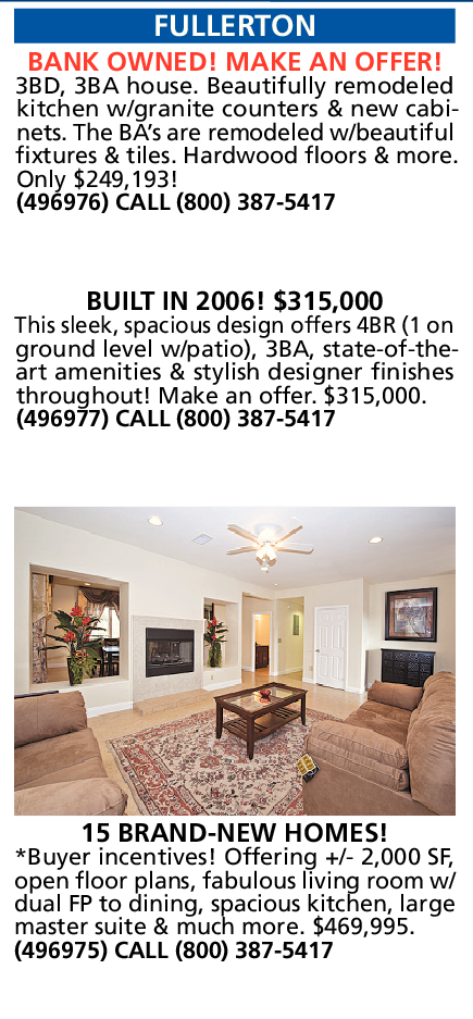 FULLERTON BANK OWNED! MAKE AN OFFER! 3BD, 3BA house. Beautifully remodeled kitchen w/granite counters & new cabinets. The BA’s are remodeled w/beautiful fixtures & tiles. Hardwood floors & more. Only $249,193! (496976) CALL (800) 387-5417 BUILT IN 2006! $315,000 This sleek, spacious design offers 4BR (1 on ground level w/patio), 3BA, state-of-theart amenities & stylish designer finishes throughout! Make an offer. $315,000. (496977) CALL (800) 387-5417 15 BRAND-NEW HOMES! *Buyer incentives! Offering +/- 2,000 SF, open floor plans, fabulous living room w/ dual FP to dining, spacious kitchen, large master suite & much more. $469,995. (496975) CALL (800) 387-5417
