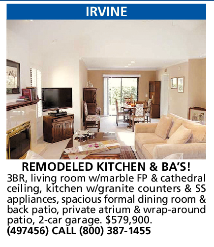 IRVINE REMODELED KITCHEN & BA’S! 3BR, living room w/marble FP & cathedral ceiling, kitchen w/granite counters & SS appliances, spacious formal dining room & back patio, private atrium & wrap-around patio, 2-car garage. $579,900. (497456) CALL (800) 387-1455