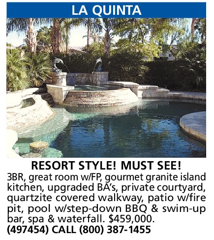 LA QUINTA RESORT STYLE! MUST SEE! 3BR, great room w/FP, gourmet granite island kitchen, upgraded BA’s, private courtyard, quartzite covered walkway, patio w/fire pit, pool w/step-down BBQ & swim-up bar, spa & waterfall. $459,000. (497454) CALL (800) 387-1455