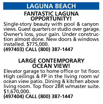 LAGUNA BEACH FANTASTIC LAGUNA OPPORTUNITY! Single-story beauty with pool & canyon views. Guest quarters or studio over garage. Owner’s loss, your gain. Under construction almost done. New doors & windows installed. $775,000. (497403) CALL (800) 387-1447 LARGE CONTEMPORARY OCEAN VIEW! Elevator garage to home office or 1st floor. High ceilings & FP in the living room w/ ocean view patio. Dining & kitchen above living room. Top floor 2BR w/master suite. $1,670,000. (497404) CALL (800) 387-1447
