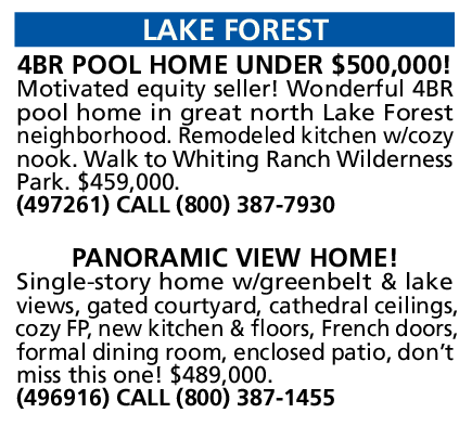 LAKE FOREST 4BR POOL HOME UNDER $500,000! Motivated equity seller! Wonderful 4BR pool home in great north Lake Forest neighborhood. Remodeled kitchen w/cozy nook. Walk to Whiting Ranch Wilderness Park. $459,000. (497261) CALL (800) 387-7930 PANORAMIC VIEW HOME! Single-story home w/greenbelt & lake views, gated courtyard, cathedral ceilings, cozy FP, new kitchen & floors, French doors, formal dining room, enclosed patio, don’t miss this one! $489,000. (496916) CALL (800) 387-1455
