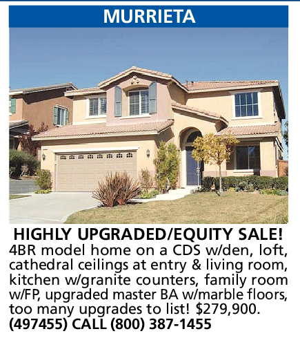 MURRIETA HIGHLY UPGRADED/EQUITY SALE! 4BR model home on a CDS w/den, loft, cathedral ceilings at entry & living room, kitchen w/granite counters, family room w/FP, upgraded master BA w/marble floors, too many upgrades to list! $279,900. (497455) CALL (800) 387-1455