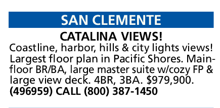 Coastline, harbor, hills & city lights views! Largest floor plan in Pacific Shores. Mainfloor BR/BA, large master suite w/cozy FP & large view deck. 4BR, 3BA. $979,900. (496959) CALL (800) 387-1450