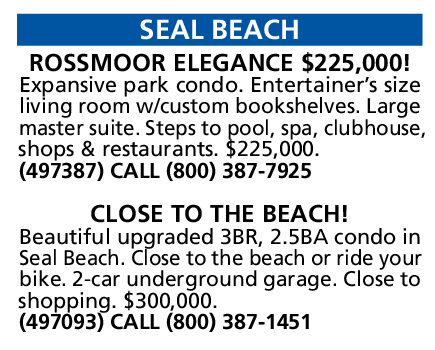 SEAL BEACH ROSSMOOR ELEGANCE $225,000! Expansive park condo. Entertainer’s size living room w/custom bookshelves. Large master suite. Steps to pool, spa, clubhouse, shops & restaurants. $225,000. (497387) CALL (800) 387-7925 CLOSE TO THE BEACH! Beautiful upgraded 3BR, 2.5BA condo in Seal Beach. Close to the beach or ride your bike. 2-car underground garage. Close to shopping. $300,000. (497093) CALL (800) 387-1451