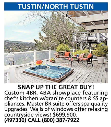 TUSTIN/NORTH TUSTIN SNAP UP THE GREAT BUY! Custom 4BR, 4BA showplace featuring chef’s kitchen w/granite counters & SS appliances. Master BR suite offers spa quality upgrades. Walls of windows offer relaxing countryside views! $699,900. (497330) CALL (800) 387-7922