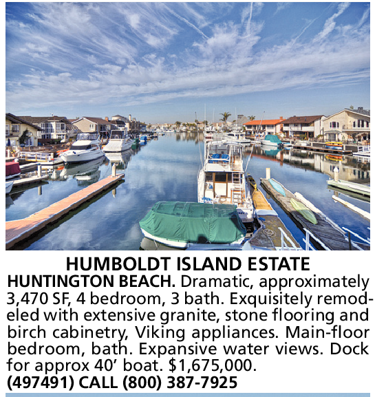 HUMBOLDT ISLAND ESTATE HUNTINGTON BEACH. Dramatic, approximately 3,470 SF, 4 bedroom, 3 bath. Exquisitely remodeled with extensive granite, stone flooring and birch cabinetry, Viking appliances. Main-floor bedroom, bath. Expansive water views. Dock for approx 40’ boat. $1,675,000. (497491) CALL (800) 387-7925