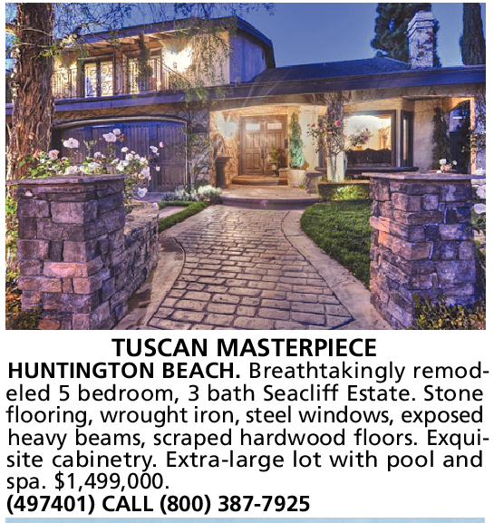 TUSCAN MASTERPIECE HUNTINGTON BEACH. Breathtakingly remodeled 5 bedroom, 3 bath Seacliff Estate. Stone flooring, wrought iron, steel windows, exposed heavy beams, scraped hardwood floors. Exquisite cabinetry. Extra-large lot with pool and spa. $1,499,000. (497401) CALL (800) 387-7925