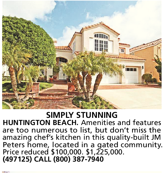 SIMPLY STUNNING HUNTINGTON BEACH. Amenities and features are too numerous to list, but don’t miss the amazing chef’s kitchen in this quality-built JM Peters home, located in a gated community. Price reduced $100,000. $1,225,000. (497125) CALL (800) 387-7940