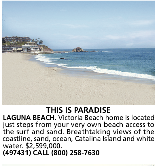 THIS IS PARADISE LAGUNA BEACH. Victoria Beach home is located just steps from your very own beach access to the surf and sand. Breathtaking views of the coastline, sand, ocean, Catalina Island and white water. $2,599,000. (497431) CALL (800) 258-7630