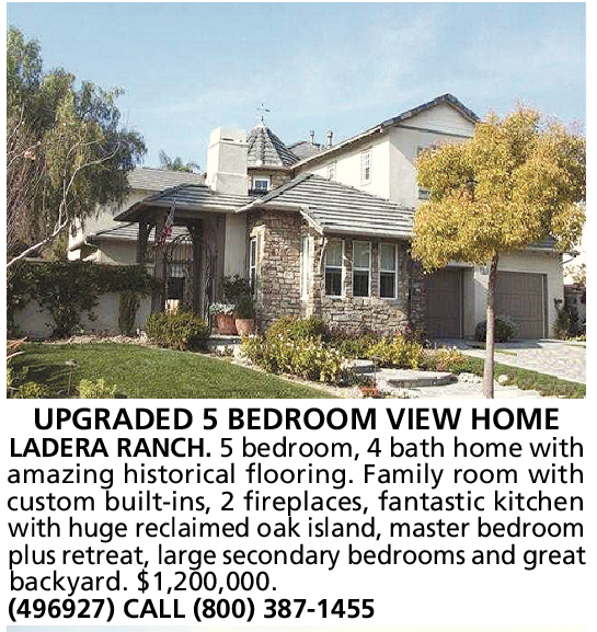 UPGRADED 5 BEDROOM VIEW HOME LADERA RANCH. 5 bedroom, 4 bath home with amazing historical flooring. Family room with custom built-ins, 2 fireplaces, fantastic kitchen with huge reclaimed oak island, master bedroom plus retreat, large secondary bedrooms and great backyard. $1,200,000. (496927) CALL (800) 387-1455