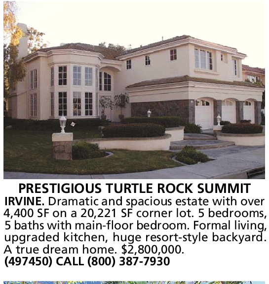 PRESTIGIOUS TURTLE ROCK SUMMIT IRVINE. Dramatic and spacious estate with over 4,400 SF on a 20,221 SF corner lot. 5 bedrooms, 5 baths with main-floor bedroom. Formal living, upgraded kitchen, huge resort-style backyard. A true dream home. $2,800,000. (497450) CALL (800) 387-7930