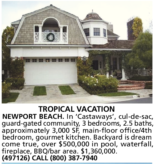 TROPICAL VACATION NEWPORT BEACH. In ‘Castaways’, cul-de-sac, guard-gated community, 3 bedrooms, 2.5 baths, approximately 3,000 SF, main-floor office/4th bedroom, gourmet kitchen. Backyard is dream come true, over $500,000 in pool, waterfall, fireplace, BBQ/bar area. $1,360,000. (497126) CALL (800) 387-7940