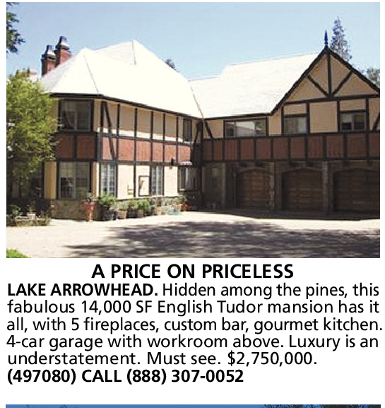 A PRICE ON PRICELESS LAKE ARROWHEAD. Hidden among the pines, this fabulous 14,000 SF English Tudor mansion has it all, with 5 fireplaces, custom bar, gourmet kitchen. 4-car garage with workroom above. Luxury is an understatement. Must see. $2,750,000. (497080) CALL (888) 307-0052