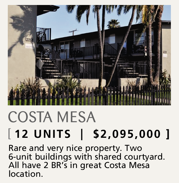 Rare and very nice property. Two 6-unit buildings with shared courtyard. All have 2 BR’s in great Costa Mesa location.