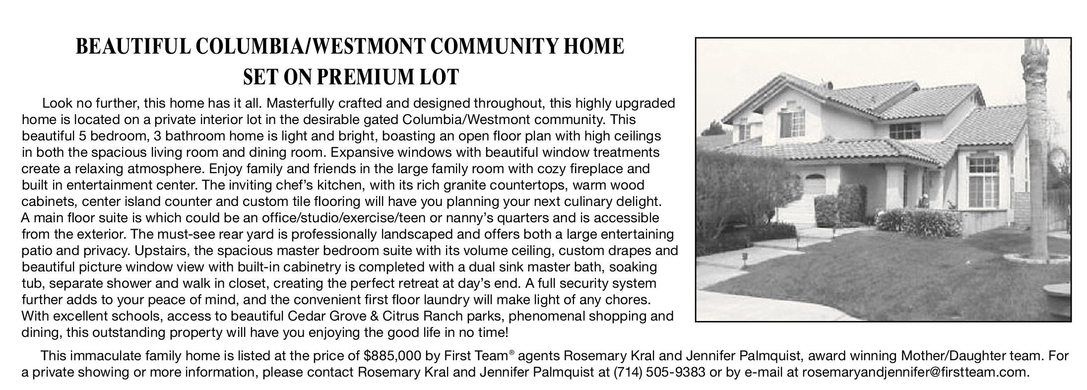 This immaculate family home is listed at the price of $885,000 by First Team ® agents Rosemary Kral and Jennifer Palmquist, award winning Mother/Daughter team. For a private showing or more information, please contact Rosemary Kral and Jennifer Palmquist at (714) 505-9383 or by e-mail at rosemaryandjennifer@firstteam.com.