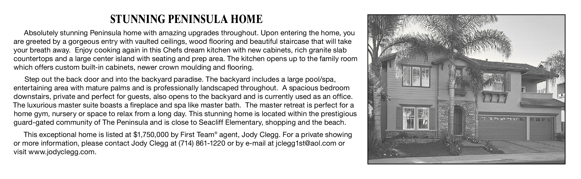 This exceptional home is listed at $1,750,000 by First Team ® agent, Jody Clegg. For a private showing or more information, please contact Jody Clegg at (714) 861-1220 or by e-mail at jclegg1st@aol.com or visit www.jodyclegg.com.
