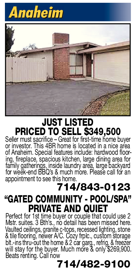 Anaheim JUST LISTED PRICED TO SELL $349,500 Seller must sacrifice – Great for first-time home buyer or investor. This 4BR home is located in a nice area of Anaheim. Special features include: hardwood flooring, fireplace, spacious kitchen, large dining area for family gatherings, inside laundry area, large backyard for week-end BBQ’s & much more. Please call for an appointment to see this home. 714/843-0123 “GATED COMMUNITY - POOL/SPA” PRIVATE AND QUIET Perfect for 1st time buyer or couple that could use 2 Mstr. suites. 3 Bth’s., no detail has been missed here. Vaulted ceilings, granite c-tops, recessed lighting, stone & tile flooring, newer A/C. Cozy frplc., custom storage blt.-ins thru-out the home & 2 car garg., refrig. & freezer will stay for the buyer. Much more & only $269,900. Beats renting. Call now 714/482-9100