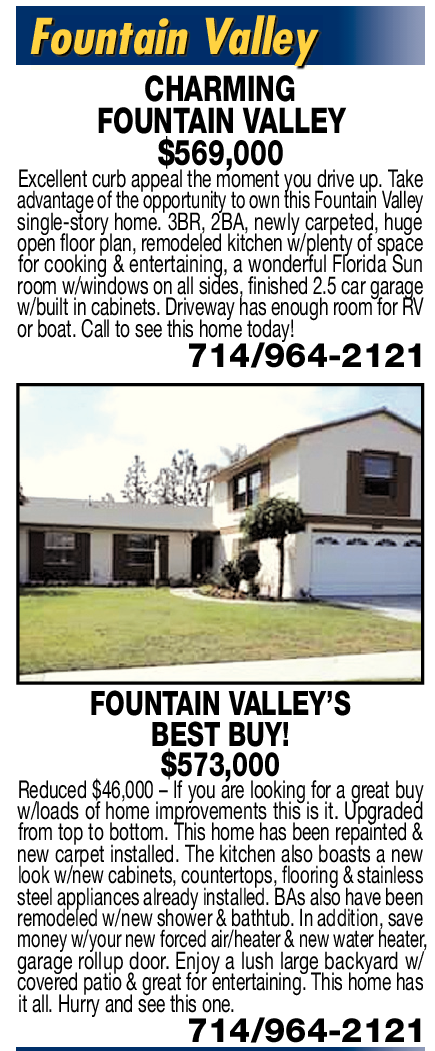Fountain Valley CHARMING FOUNTAIN VALLEY $569,000 Excellent curb appeal the moment you drive up. Take advantage of the opportunity to own this Fountain Valley single-story home. 3BR, 2BA, newly carpeted, huge open floor plan, remodeled kitchen w/plenty of space for cooking & entertaining, a wonderful Florida Sun room w/windows on all sides, finished 2.5 car garage w/built in cabinets. Driveway has enough room for RV or boat. Call to see this home today! 714/964-2121 FOUNTAIN VALLEY’S BEST BUY! $573,000 Reduced $46,000 – If you are looking for a great buy w/loads of home improvements this is it. Upgraded from top to bottom. This home has been repainted & new carpet installed. The kitchen also boasts a new look w/new cabinets, countertops, flooring & stainless steel appliances already installed. BAs also have been remodeled w/new shower & bathtub. In addition, save money w/your new forced air/heater & new water heater, garage rollup door. Enjoy a lush large backyard w/ covered patio & great for entertaining. This home has it all. Hurry and see this one. 714/964-2121
