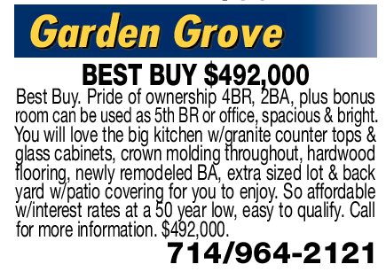 714/964-2121 Garden Grove BEST BUY $492,000 Best Buy. Pride of ownership 4BR, 2BA, plus bonus room can be used as 5th BR or office, spacious & bright. You will love the big kitchen w/granite counter tops & glass cabinets, crown molding throughout, hardwood flooring, newly remodeled BA, extra sized lot & back yard w/patio covering for you to enjoy. So affordable w/interest rates at a 50 year low, easy to qualify. Call for more information. $492,000. 714/964-2121