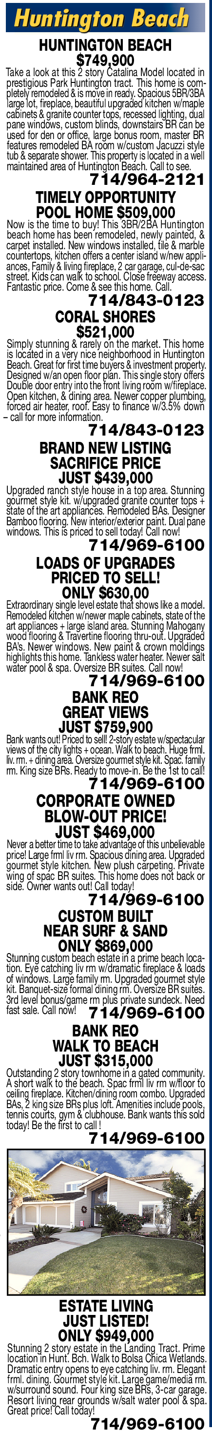 714/969-6100 CUSTOM BUILT NEAR SURF & SAND ONLY $869,000 Stunning custom beach estate in a prime beach location. Eye catching liv rm w/dramatic fireplace & loads of windows. Large family rm. Upgraded gourmet style kit. Banquet-size formal dining rm. Oversize BR suites. 3rd level bonus/game rm plus private sundeck. Need fast sale. Call now! 714/969-6100