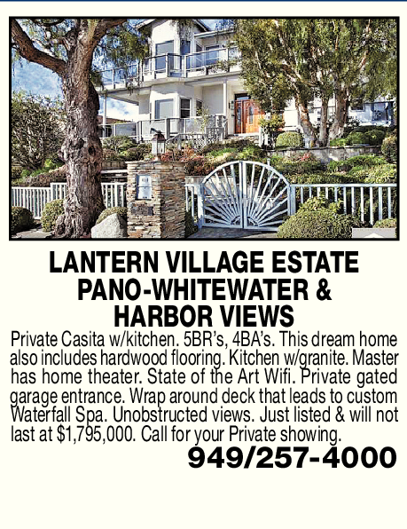 LANTERN VILLAGE ESTATE PANO-WHITEWATER & HARBOR VIEWS Private Casita w/kitchen. 5BR’s, 4BA’s. This dream home also includes hardwood flooring. Kitchen w/granite. Master has home theater. State of the Art Wifi. Private gated garage entrance. Wrap around deck that leads to custom Waterfall Spa. Unobstructed views. Just listed & will not last at $1,795,000. Call for your Private showing. 949/257-4000