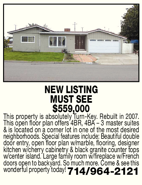 NEW LISTING MUST SEE $559,000 This property is absolutely Turn-Key. Rebuilt in 2007. This open floor plan offers 4BR, 4BA – 3 master suites & is located on a corner lot in one of the most desired neighborhoods. Special features include: Beautiful double door entry, open floor plan w/marble, flooring, designer kitchen w/cherry cabinetry & black granite counter tops w/center island. Large family room w/fireplace w/French doors open to backyard. So much more. Come & see this wonderful property today! 714/964-2121