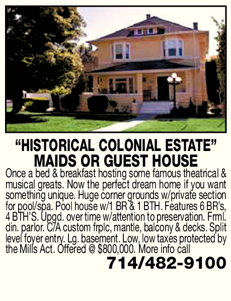 “HISTORICAL COLONIAL ESTATE” MAIDS OR GUEST HOUSE Once a bed & breakfast hosting some famous theatrical & musical greats. Now the perfect dream home if you want something unique. Huge corner grounds w/private section for pool/spa. Pool house w/1 BR & 1 BTH. Features 6 BR’s, 4 BTH’S. Upgd. over time w/attention to preservation. Frml. din. parlor. C/A custom frplc, mantle, balcony & decks. Split level foyer entry. Lg. basement. Low, low taxes protected by the Mills Act. Offered @ $800,000. More info call 714/482-9100