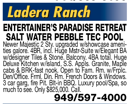 714/969-6100 Ladera Ranch ENTERTAINER’S PARADISE RETREAT SALT WATER PEBBLE TEC POOL Newer Majestic 2 Sty. upgraded w/showcase amenities galore. 4BR, incl. Huge Mstr-Suite w/Elegant BA w/designer Tiles & Stone. Balcony. 4BA total. Huge Deluxe Kitchen w/island, S.S. Appls. Granite, Maple cabs & BRK-fast nook. Open to Fam. Rm. w/Frplc. Den/Office. Frml. Din. Rm. French Doors & Windows. 3 car garg, fire Pit. Blt-in BBQ. Luxury pool/Spa, so much to see. Only $825,000. Call. 949/597-4000