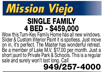 Mission Viejo SINGLE FAMILY 4 BED - $459,000 Wow this Turn-Key Family Home has all new windows. Slider & Custom Interior Paint it is spotless. Just move on in, it’s perfect. The Master has wonderful retreat. Be a member of Lake M.V. $17.00 per month. Just a short jaunt to Private Park & Schools. This is a regular sale and surely won’t last long. Call 949/257-4000 See also