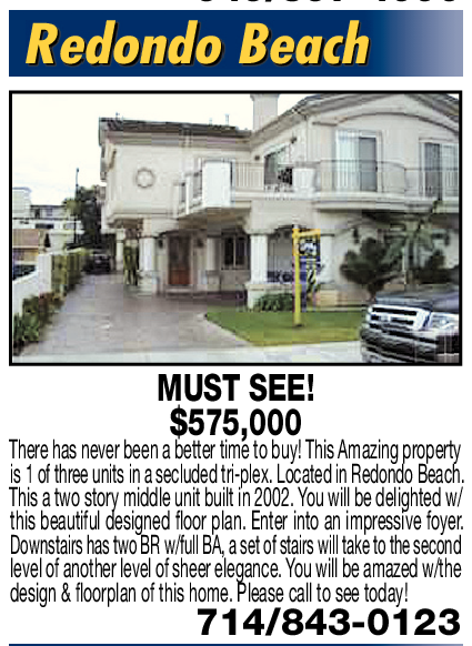 w/F.P. 949/597-4000 Redondo Beach MUST SEE! $575,000 There has never been a better time to buy! This Amazing property is 1 of three units in a secluded tri-plex. Located in Redondo Beach. This a two story middle unit built in 2002. You will be delighted w/ this beautiful designed floor plan. Enter into an impressive foyer. Downstairs has two BR w/full BA, a set of stairs will take to the second level of another level of sheer elegance. You will be amazed w/the design & floorplan of this home. Please call to see today! 714/843-0123