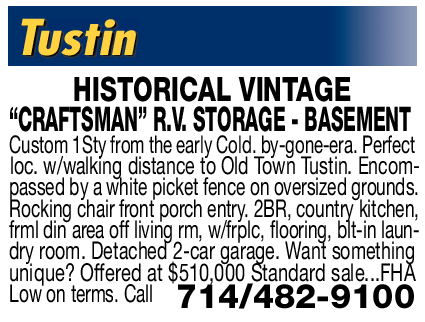 Spa, @$789,000. Tustin HISTORICAL VINTAGE “CRAFTSMAN” R.V. STORAGE - BASEMENT Custom 1Sty from the early Cold. by-gone-era. Perfect loc. w/walking distance to Old Town Tustin. Encompassed by a white picket fence on oversized grounds. Rocking chair front porch entry. 2BR, country kitchen, frml din area off living rm, w/frplc, flooring, blt-in laundry room. Detached 2-car garage. Want something unique? Offered at $510,000 Standard sale...FHA Low on terms. Call 714/482-9100