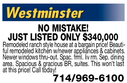 Westminster NO MISTAKE! JUST LISTED ONLY $340,000 Remodeled ranch style house at a bargain price! Beautiful remodeled kitchen w/newer appliances & cabinets. Newer windows thru-out. Spac. frml. liv rm. Sep. dining area. Spacious & gracious BR, suites. This won’t last at this price! Call today! 714/969-6100