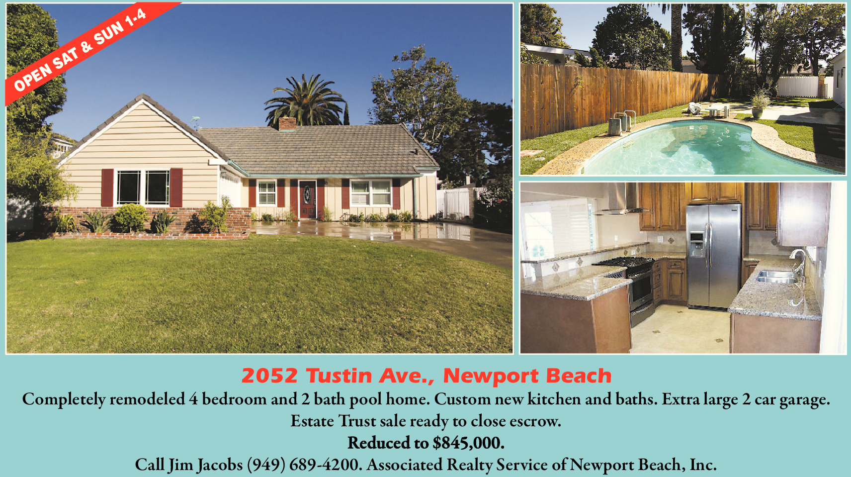 2052 Tustin Ave., Newport Beach Completely remodeled 4 bedroom and 2 bath pool home. Custom new kitchen and baths. Extra large 2 car garage. Estate Trust sale ready to close escrow. Reduced to $845,000. Call Jim Jacobs (949) 689-4200. Associated Realty Service of Newport Beach, Inc.